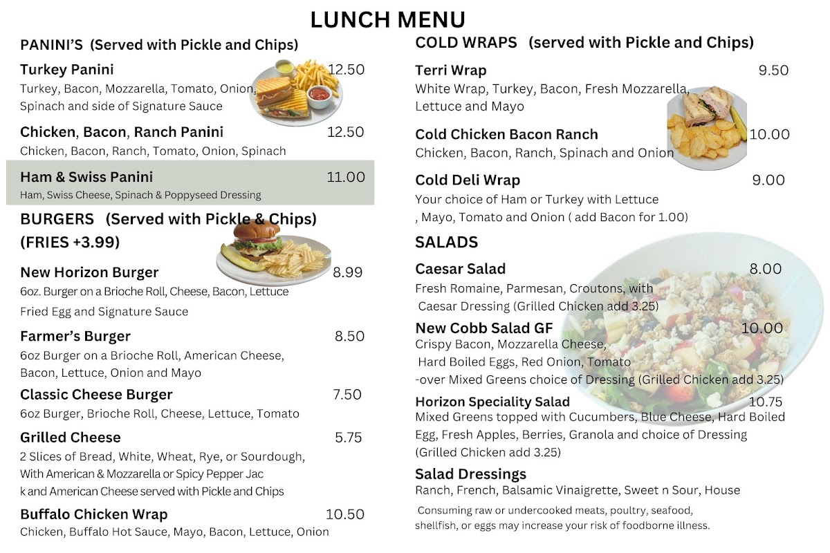 Welcome to New Horizon Cafe, a charming spot located at 5413 Carlisle Pike, New Oxford, PA. This delightful cafe is the perfect destination for breakfast and lunch lovers alike. With an extensive menu featuring waffles topped with buttery bliss and an array of toppings, and wraps customizable with savory ingredients like homemade ranch and pepper jack cheese, there's something to satisfy every palate.