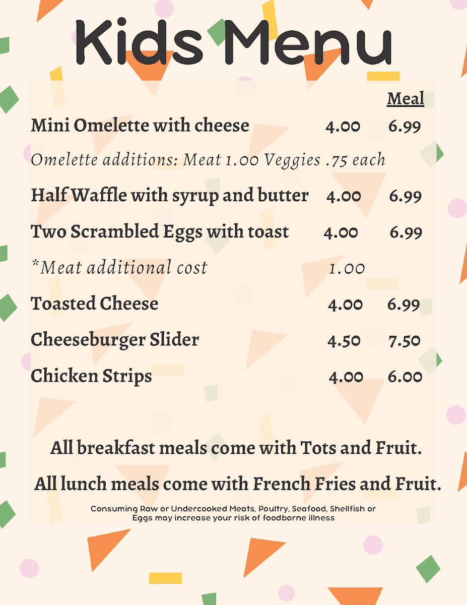 Kids Menu (breakfast meals come with tots and fruit; lunch meals come with french fries and fruit)